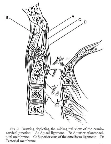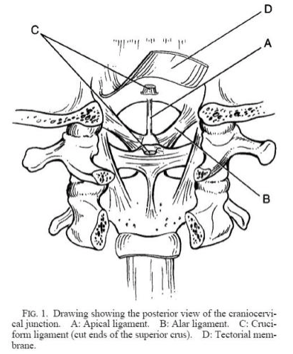 - 십자인대는 치돌기가 척수내로 아탈구 되는 것을 방지하기 위해 안정성을 만드는 기능.