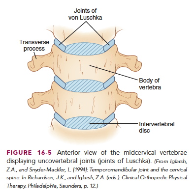 In the upper cervical spine (C1-C2), the foramen transversarium is located more laterally than in the mid-cervical spine, thus requiring the vertebral artery to ascend in a lateral direction in this region. Weight bearing is absorbed superiorly as the axis articulates with the inferior facets located on the lateral masses of the atlas and is transmitted inferiorly through the inferior facet joints, which are located more posteriorly on the axis, similar to those in the mid-cervical region. Uncovertebral joints (joints of Luschka), first described by von Luschka, are believed to develop because of degenerative changes in the annulus fibrosus (Fig. 16-5 ).