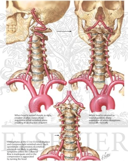 - C1-2에서 횡돌기구멍은 중부 경추보다 바깥쪽에 위치하여 Vertebral artery 외측방향으로 돌아 올라감.