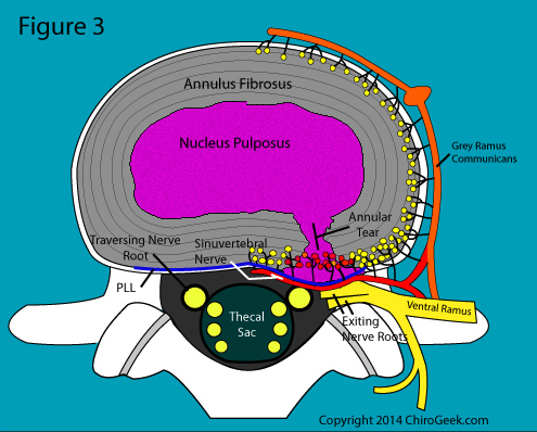 As a person ages, the amount of proteoglycan and therefore the amount of water begin to diminish.3 The IVDs are avascular and depend on diffusion from the vertebral end plates for their nutrition. The disk is innervated along the periphery of the annulus fibrosus through the sinuvertebral nerve.4