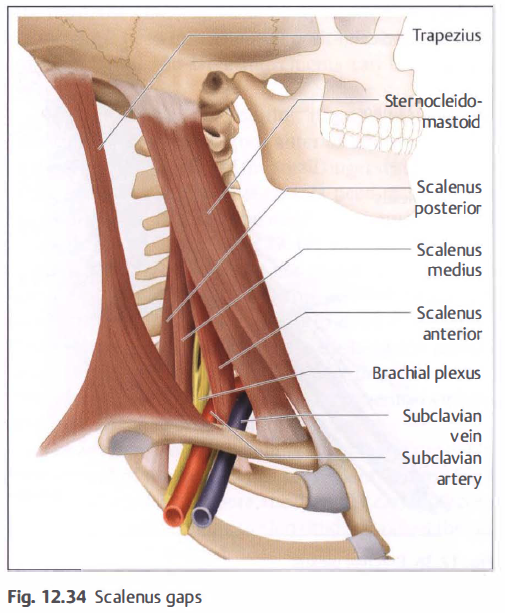 The scaleni muscles can be reached well using palpation. They cover the anterolateral region of the throat and are only partially covered by the sternocleidomastoid. The anterior scalenus gap ( Fig. 1 2.34) is formed by the sternocleidomastoid and scalenus anterior. The subclavian vein and the phrenic nerve pass through here.