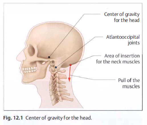 The cervical spine supports the head (approximately 10% of the weight of the body). The head's center of gravity is found at the level of the sella turcica ( Fig. 1 2.1 ) and is therefore positioned slightly anterior to the CO/Cl and Cl/C2 joints so that the neck muscles are always slightly tensed when in an upright posture (Kapandji, 2006).
