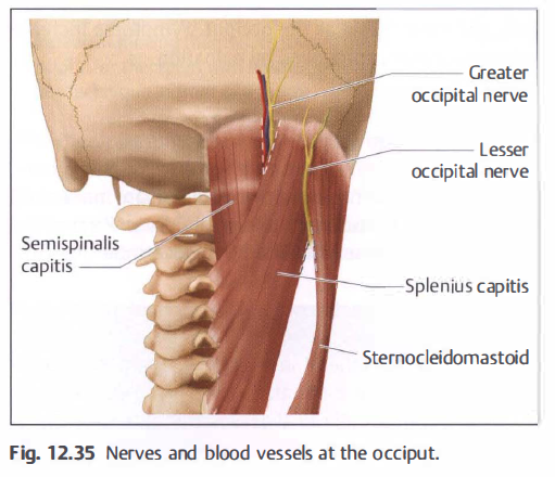 - 대후두 신경은 semispinalis captis와 splenius capitis사이를 지나 후두부로 올라 감