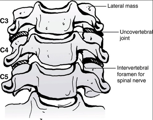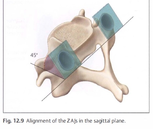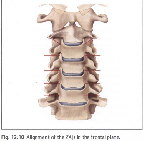 The zygapophysialjoints (ZAjs) form the "articular column" (see Fig. 1 2.4) that is almost as wide as the row of transverse processes. The vertebrae, as a whole, have very wide bases due to the extremely lateral position of the joints, which results in the lower cervical spine being not particularly ideal for movement into lateral flexion. A narrow base (less distance between the left and right ZAjs), as is seen in the lumbar spine, is more conducive to lateral flexion.