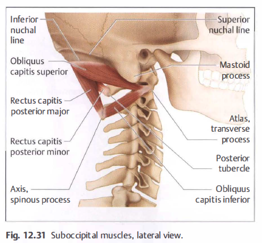 - Obliquus capitis superior extends from the Cl transverse process in an almost lateral direction in the sagittal plane and inserts into the inferior nuchal line (retromastoid process, see the section "Anatomy of the Occiput and the Upper Cervical