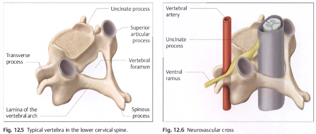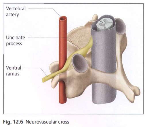 The groove is at its narrowest in its medial section and is bordered by bones on all sides. The uncinate process forms the anterior border; the superior articular process of the ZAj the posterior border. The artery and the ventral ramus of the spinal nerve cross paths at this bony constriction ( Fig. 12.6).