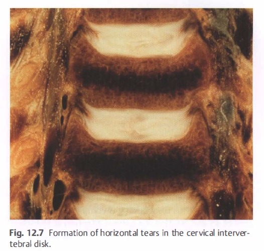 - 경추간판의 바깥쪽 tear는 추간판의 bisection을 일으킬 수 있음. 이렇게 되면 수핵물질이 새어나가지 않으면서 얇아짐. 이러한 추간판의 bisection은 45-50세에 끝남.