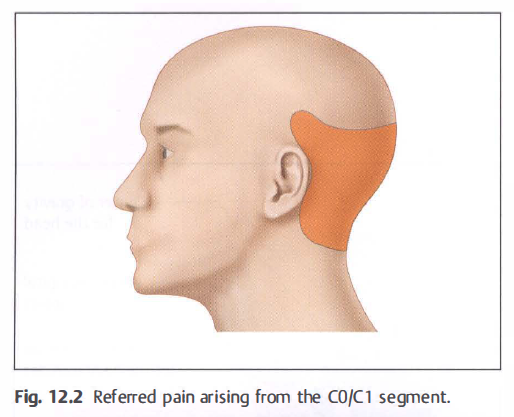 Long-term irritation of a facet joint causes pain felt in other areas (referred pain). It is not possible to link the patient's reported area of referred pain with a specific level in the cervical spine. In 1994, Dreyfuss et al. wrote that referred pain arising from the CO/Cl segment can extend quite a way up onto the occiput ( Fig. 1 2.2 ).