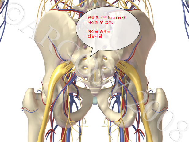 - 이상근 증후군은 좌골신경이 두분지로 나뉘어 근육사이로 지나올때 발생.. 4-10%정도 변이가 있음.