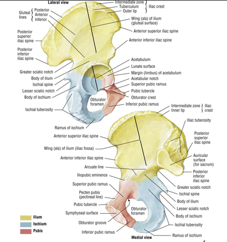 - 장골의 날개부위는 크게 튀어나와 연부조직 부착부를 제공함.