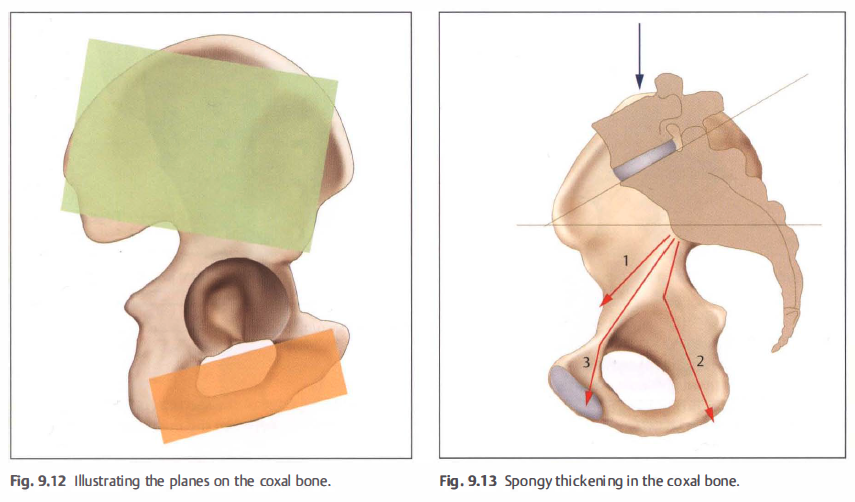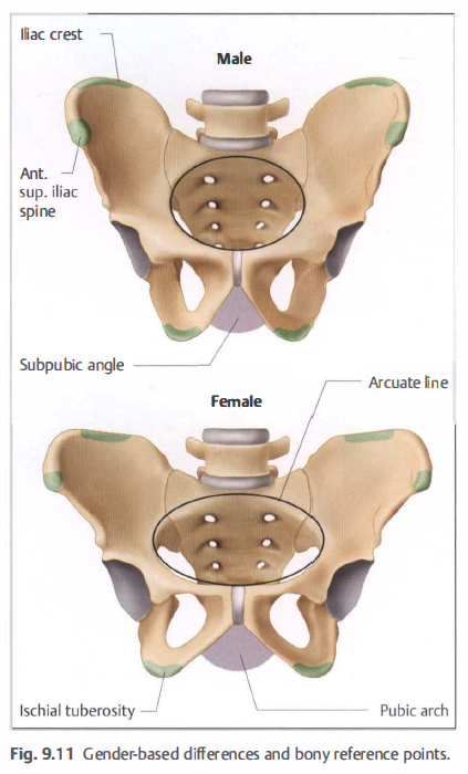 Several points on the pelvis are of static and dynamic significance: the base of the sacrum, iliac crest, SI joint, pubic symphysis, and the ischial tuberosity. The different types of loading are dealt with here, for example, by transferring the load in sitting or standing. Important ligamental structures and muscles insert here.