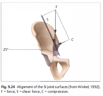 truncal loads to the lower extremities, limiting x-axis rotation, and facilitating parturition. Compared to the lumbar spine, the SI joints can withstand a medially directed force 6 times greater but only half the torsion and 1/20th of the axial compression load (17). These last 2 motions may preferentially strain and injure the weaker anterior joint capsule (18).