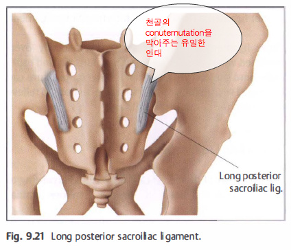 - 요추와 비교하여 천장관절은 내측으로 6배힘을 더 견딜 수 있지만 torsion은 1/2, 축성압박부하는 1/20힘을 견딜 수있음.