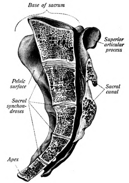 The sacrum has remained in the same position in the sagittal plane, tilting inward toward the abdominal cavity. This allows lumbar lordosis and enhances shock absorption. Ligaments stabilize the sacrum's position.