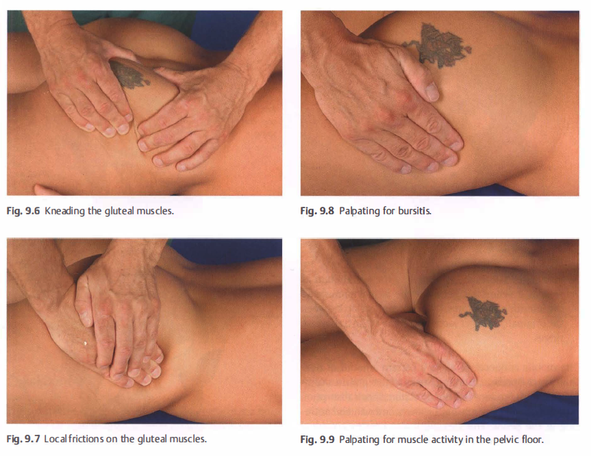 Dvorak labeled tender points as tendinoses and zones of irritation. Local in vivo anatomy is used here to find the appropriate muscular structure or to link the point that is tender on palpation to its respective muscle. Muscle pathologies are treated using classical massage techniques, such as kneading (Fig. 9.6), local frictions (Fig. 9.7), or a variety of specialized techniques. These techniques can be conducted more accurately when the therapist has a good knowledge of the available area and can correctly feel the muscular structure being sought. Precise palpation is also used to confirm bursitis by applying local and direct pressure (Fig. 9.8) (e.g., when presented with a type of snapping hip) or to perceive muscle activity in the pelvic floor directly medial to the ischial tuberosity (Fig. 9.9).