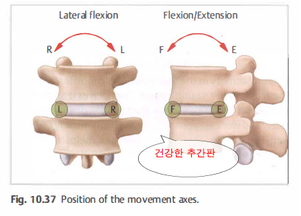 - 건강한 요추분절에서 움직임을 위한 축은 추간판에서 발견됨. 건강한 요추분절은 적은 이동움직임과 많은 tilting을 야기함.