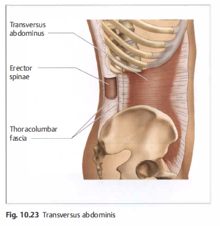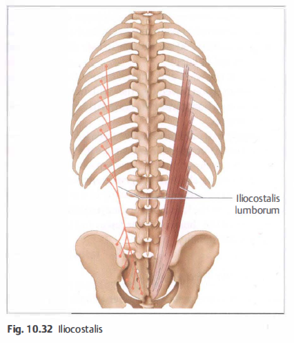 The iliocostalis ( Fig. 1 0.32), on the other hand, is located lateral and more superficial. Its origin extends from the lateral aspect of the sacrum to the iliac crest, covering the medial section of the quadratus lumborum. The muscle originates and inserts further onto the ribs and the rudiments of the ribs only. Both layers of the thoracolumbar fascia meet lateral to the muscle belly.