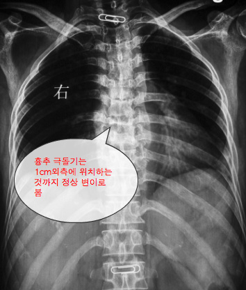 - 흉추 12번 극돌기는 항상 요추 1번 극돌기보다 작음.