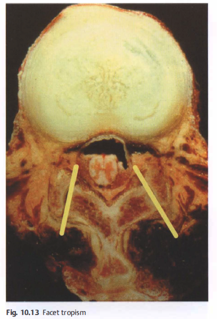 The lumbar segment is a kinematic chain consisting of three links-one intervertebral disk and two zygapophysial joints. The three components all affect each other. In a healthy segment, the axes for movement are found in the disk ( Fig. 1 0.37). This results in little translational movement and a lot of tilting. A loss of height in the intervertebral disk shifts the axes and more shear forces develop (White and Pandjabi, 1990).