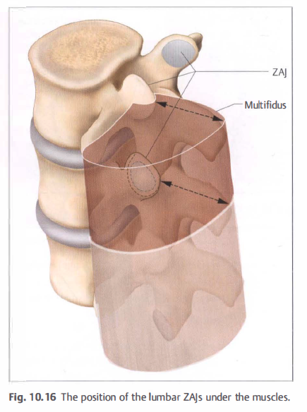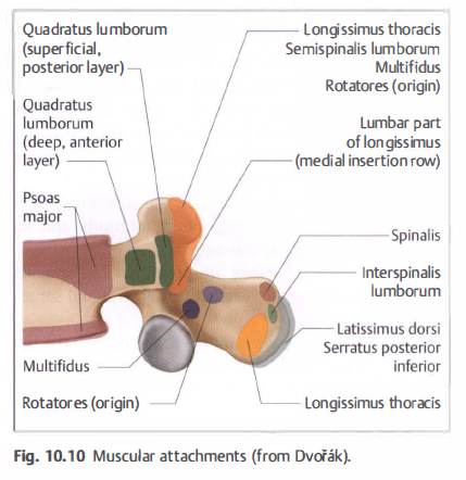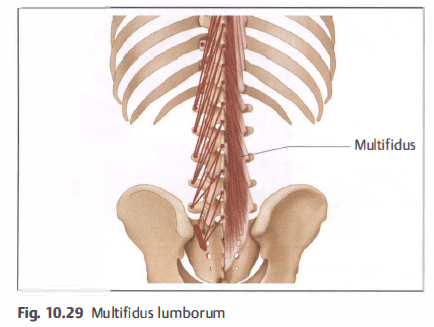 "The transverso-spinales muscle strand represents the most important tensile system in the vertebral column." The muscular sections of this system extend over three to six segments and are most clearly developed in the lumbar region. They are labeled the multifidus lumborum( Fig. 1 0. 29).