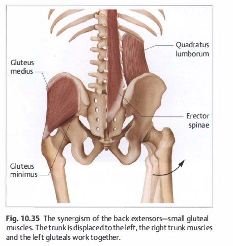 - 등과 몸통 측면근육은 복부근육 길항근으로 작용함. 걷는 동안 팔을 흔들고, 상체에 회전충격을 제공함.