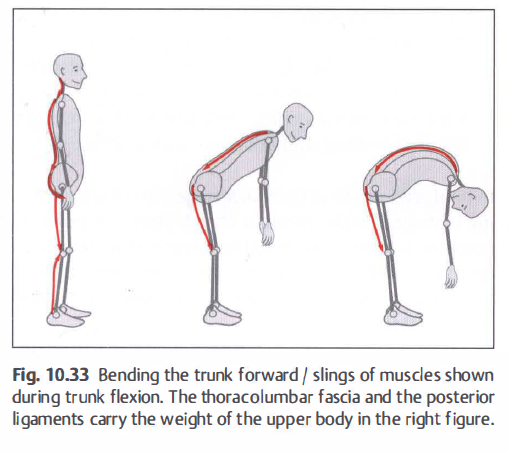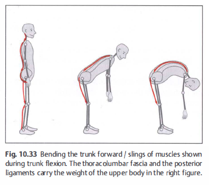 Bilateral activity in the back extensors controls and moves the trunk in the sagittal plane. The back extensors tense quickly on both sides when the trunk is displaced anteriorly and work eccentrically until approximately 60° flexion (Fig. 1 0.33).