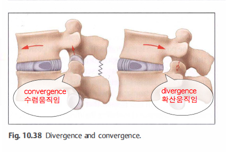 - 요추 신전동안 관절면이 함께 이동(수렴 움직임)함. 그리고 서로 멀어지는 움직임이 요추굴곡 동안 일어남.