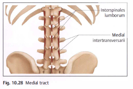 The muscles originate and insert into the processes of the lumbar vertebrae. The posterior aspect of the sacrum is the only exception here. The medial tract muscles are mostly covered by voluminous muscle bellies and the aponeuroses of origin for the muscles in the lateral tract (longsimus). The muscle groups belonging to the medial tract are typically innervated by the medial branch of the dorsal rami arising from the spinal nerve that belongs to the segment.