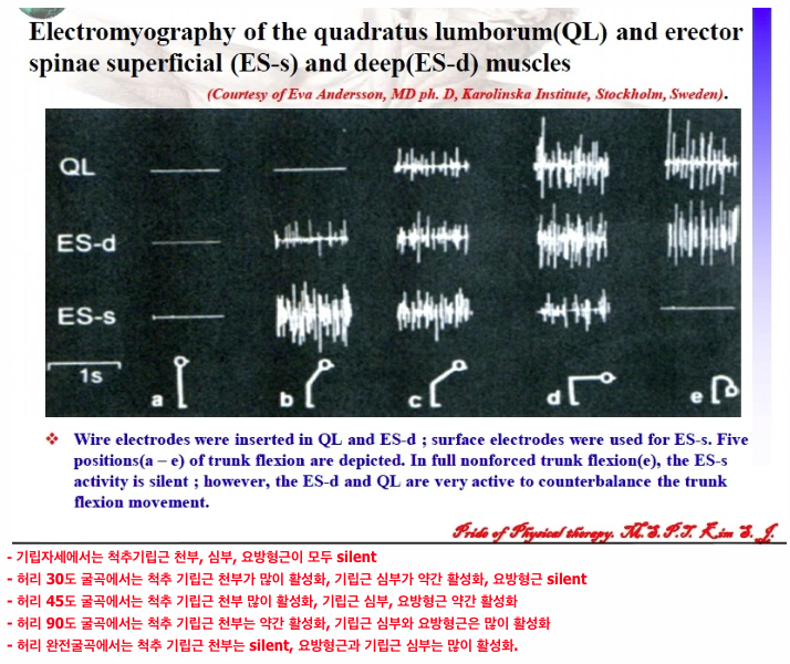 요추 굴곡60도까지 등의 신전근은 빠르게 긴장함.