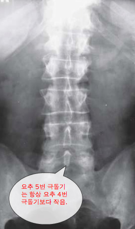 - 요추 5번 극돌기는 항상 요추 4번 극돌기보다 작음.