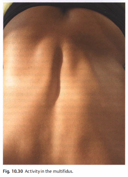 It becomes more difficult superior to this as the covering muscle becomes thicker. The advantage of the muscle being palpable becomes obvious when the stabilizing function of the multifidus is being trained. The patient can attempt to selectively contract the multifidus using palpation for feedback. Hoch- schild (200 1 . p. 37) labels the multifidus as the " key muscle for the segmental stabilization of the lumbar spine."