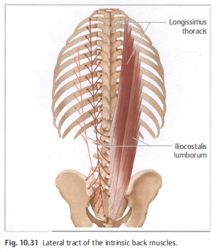 The lateral tract of the back extensors is made up of two strong individual muscles in the lumbar region. These muscles represent the largest section of the palpable paravertebral muscles ( Fig. 1 0.3 1 ):