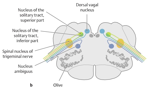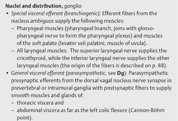 - 배측 미주신경핵(dorsal vagal nucleus)으로부터 나온 부교감성 시냅스 전 원심섬유(parasympathetic presynaptic efferent)는 thoracic viscera and abdominal viscera의 평활근(smooth muscle)과 gland에 신경유주하면서 기능함.