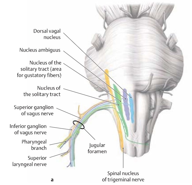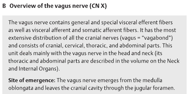 - 미주신경은 연수(medulla oblongata)에서 나와 경정맥공(jugular foramen)을 거쳐 두개강(cranial cavity)으로 유주함.