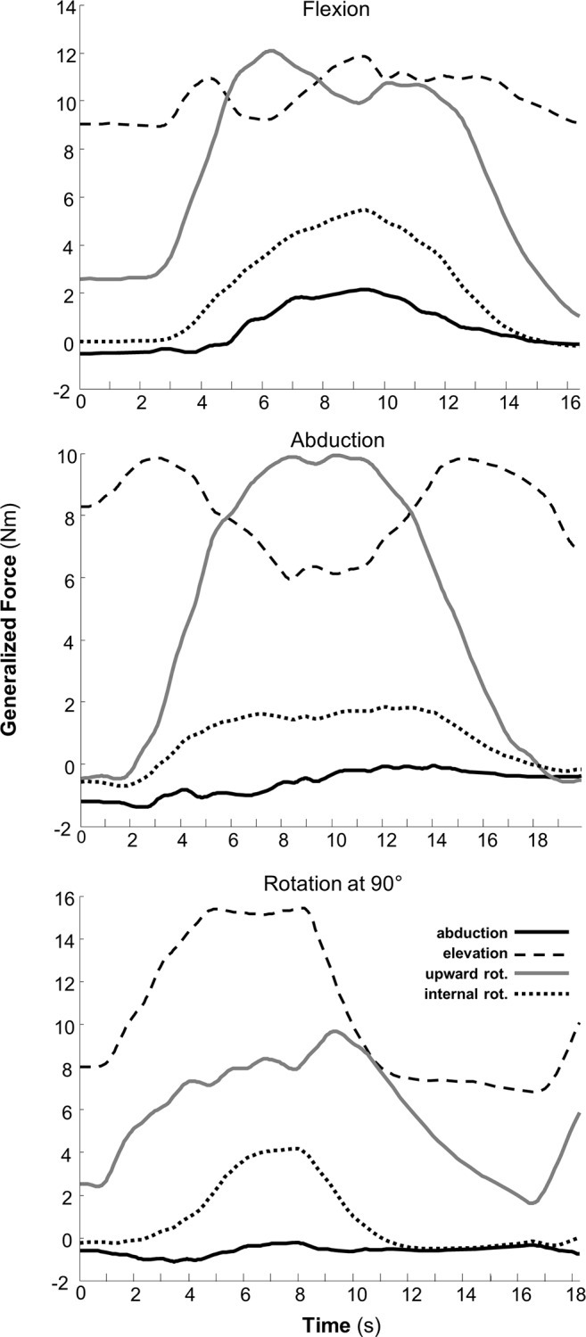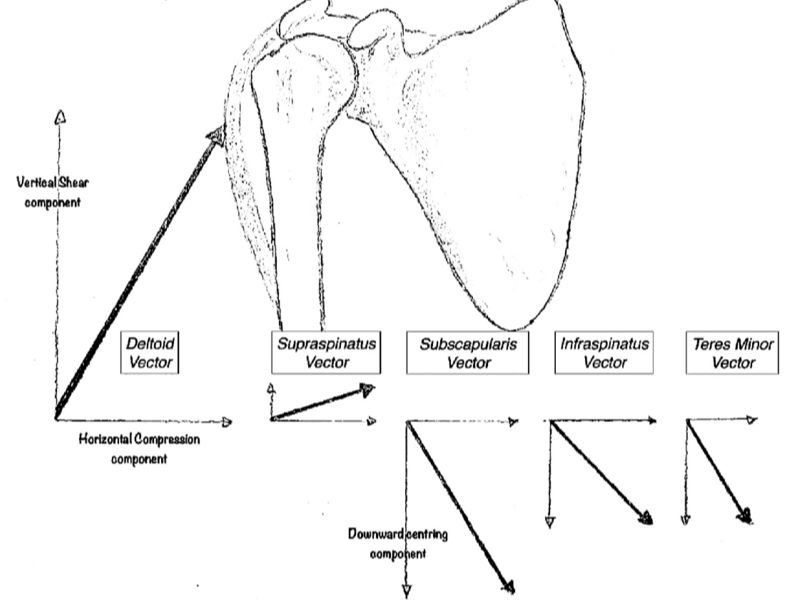 - 회전근개는 수직 force couple (deltoid vs. cuff)과 수평 force couple (subscapularis vs. infraspinatus/teres minor)을 형성.