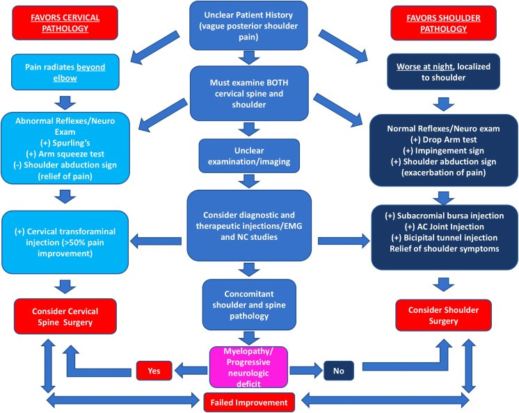 - 중간: 어깨 vs. 경추 구분 → 어깨 우선 치료 (myelopathy 제외).