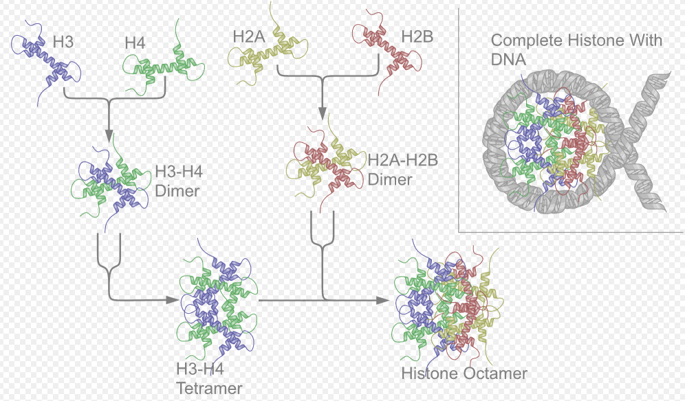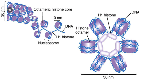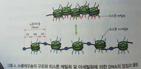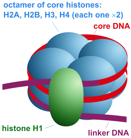 히스톤 단백질은 H1, H2A, H2B, H3, H4가 있음. DNA는 H2A-H2B-H3-H4가 아래, 위로 포개진 8개의 히스톤 복합체(histone octamer)를 146개의 염기서열이 감싸고 있는 구조가 반복됨. 이들 반복된 구조 사이에 대략 40여개의 염기서열이 있으며 중간부위에 히스톤 H1이 결합해 있음. 이처럼 DNA가 히스톤을 감싸고 있는 모양을 뉴클레오솜이라고 함. DNA염기서열이 같더라도 DNA의 상태에 따라 유전자 발현이 다르게 나타날 수 있는데 이를 주로 연구하는 학문이 '후성유전학'임.