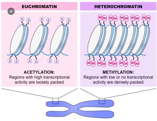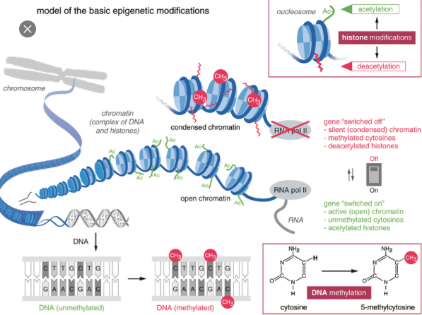 mRNA가 만들어지기 위해서는 RNA중합효소가 DNA에 결합하여야 하는데 이를 위해서는 RNA중합효소가 결합하는 DNA 염기서열부분이 노출되어 있어야 함. 만약 DNA가 엉켜서 이 부위가 닫혀있다면 RNA중합효소는 DNA에 결합하지 못하고 결국 유전자 발현은 일어나지 못함. DNA의 풀림과 엉킴을 조절하는 것은 히스톤(histone)단백질임. DNA는 히스톤 복합체를 감싸고 있는데 이를 뉴클레오솜이라고 함.