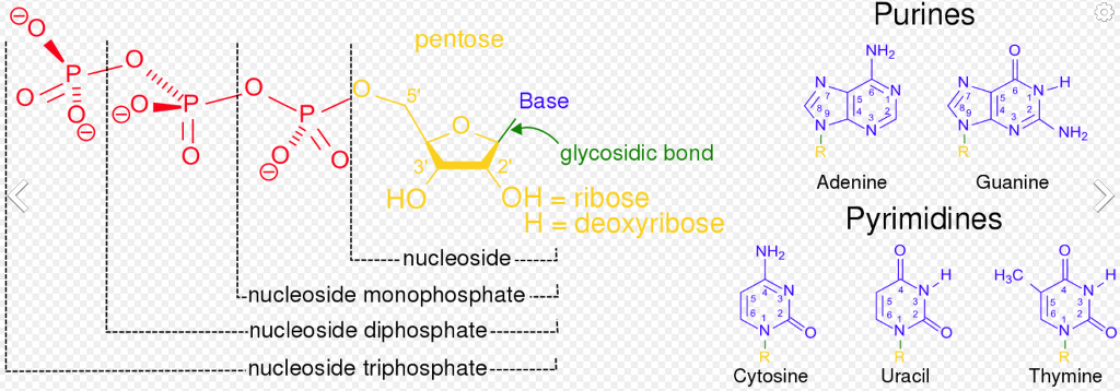 Structural elements of three nucleotides—where one-, two- or three-phosphates are attached to the nucleoside (in yellow, blue, green) at center: 1st, the nucleotide termed as a nucleoside monophosphate is formed by adding a phosphate group (in red); 2nd, adding a second phosphate group forms a nucleoside diphosphate; 3rd, adding a third phosphate group results in a nucleoside triphosphate. + The nitrogenous base (nucleobase) is indicated by "Base" and "glycosidic bond" (sugar bond).