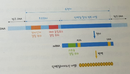 DNA로부터 mRNA가 만들어지는 전사과정(transcription)과 mRNA로부터 단백질이 만들어지는 번역(translation)과정을 통틀어서 유전자 발현(gene expression)이라고 함.