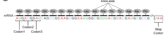 아미노산을 지정하는 mRNA의 3개 염기서열을 코돈(Codon)이라하며 이들 코돈의 조합을 유전암호(genetic code)라고 함. 4개의 염기를 이용하여 3자리의 염기서열 조합인 코돈을 만들 수 있는 경우의 수는 64가지 이므로 유전암호는 64가지가 존재하는데 각각의 유전암호는 1개의 아미노산을 지정함. 염기서열 3개가 하나의 아미노산을 지정하는 방식의 문제점은 염기서열 3개가 만들 수 있는 조합은 64가지인데 비해 아미노산의 수는 20가지이기 때문에 일대일 대응이 아님. 어떤 경우에는 여러개의 코돈이 하나의 아미노산을 지정할 수 밖에 없음.