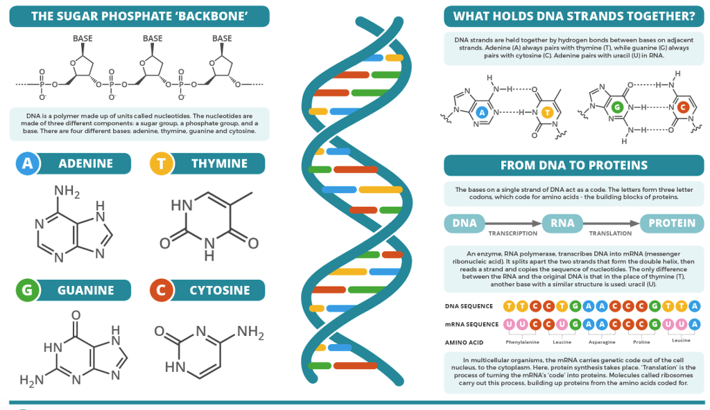 DNA구성성분은 뉴클레오티드임. 1957년 노벨화학상을 받은 알렉산더 토드는 한개의 뉴클레오티드는 당, 인산, 염기로 이루어져 있으며 염기는 네종류로 아데닌(adenine), 구아닌(guanine), 사이토신(cytocine), 티민(thymine) A,G,C,T 가 있다는 사실을 밝혀냄. 즉 DNA는 4종류의 뉴틀레오타이드로 구성됨.
