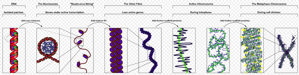 인간세포 하나하나에는 30억개 남짓의 DNA염기쌍이 23개의 염색체에 나뉜채 길게 연결되어 있음. 물론 헝클어진 실몽당이처럼 되지 않기 위해서 히스톤이라는 단백질을 실패삼아 질서정연하게 감겨있는 모양임.