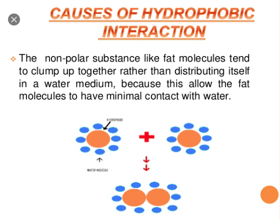 다. 소수성 상호작용(hydrophobic interaction)아미노산 또는 포도당과 같이 극성을 나타내어 물과의 상호작용이 가능한 분자들을 친수성 분자라고 부름. 긴 탄화수소 화합물을 포함한 지방 또는 스테로이드와 같은 분자들은 물의 극성부분과 상호작용 가능한 하전된 영역이 부족하여 물에 녹을 수 없음. 이러한 비극성의 화합물들은 물안에서 존재할때 서로 모이며 이는 비극성 분자들 서로에게 발생되는 강한 인력에 의해서가 아니라 주변의 극성환경에 노출되는 것을 최소화하기 위한 방법임. 이때 비극성 분자들 사이에 발생하는 인력을 '소수성 상호작용'이라고 함.