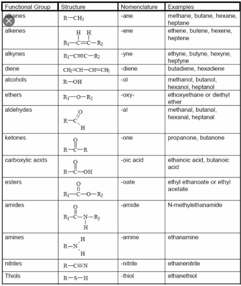 대부분 작용기의 원자단은 하나 혹은 그 이상의 전기음성도가 큰 원자들(O, N, P, S)를 포함하여 더욱 극성을 띠고 물과의 반응이 커지며 반응성이 증가함. 대표적인 작용기로서 카보닐기(carbonyl group)와 이를 포함하는 알데히드기(aldehyde group) 및 케톤기(ketone group), 히드록실기(hydroxyl group), 아미노기(amino group), 카르복실기(carboxyl group)등이 있음. 작용기들 사이에 가장 대표적인 결합에는 카복실기와 히드록실기 사이에 형성되는 에스터 결합(ester bond), 카복실기와 아민사이에 형성되는 아미드 결합(amide bond)이 있음.