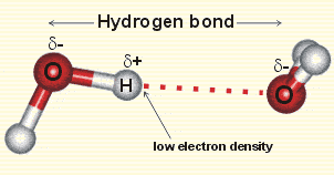 이로 인해 물분자의 산소원자와 이웃한 물분자의 수소원자 사이에 정전기적 인력이 형성되며 이를 '수소결합'이라고 함. 이러한 수소결합의 형성 및 물의 쌍극자는 물이 생체의 용매로서 작용할 수 있는 특징을 부여함. 전하를 갖지 않으나 극성을 갖는 생체분자는 쌍극자-쌍극자 상호작용을 유발하는 많은 극성 작용기를 갖고 있어서 물에서 잘 녹을 수 있음.