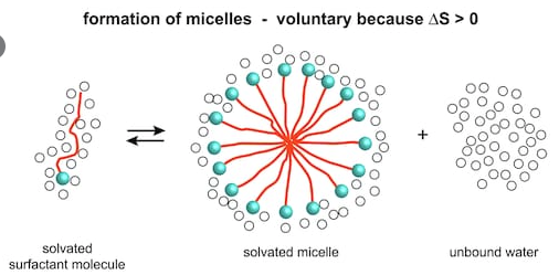 비극성 화합물은 물과 쉽게 상호작용이 가능한 이온이나 극성작용기를 가지고 있지 않기 때문에 수화될 수 없고 이온 화합물은 각각의 이온이 극성 물분자에 의해 수화될 수 있음. 극성영역과 비극성 영역을 동시에 가진 양친매성 화합물은 물과 반응하면 극성의 친수성 영역은 물(용매)과 상호작용을 최대로 되도록 배치되며 비극성의 소수성 영역은 물과의 상호작용을 최소화하기 위해 서로 뭉치게 되어 미셀구조를 형성함. 미셸이란 물속에서 양극성을 띤 화합물의 안정적 구조를 뜻하며 모든 소수성을 띠는 부위들은 물로부터 격리되고 물분자로 정렬된 껍질은 최소화됨.