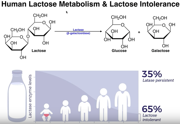 락토오스 - 락타아제(가수분해 효소) --> 갈락토스와 글루코스로 가수분해