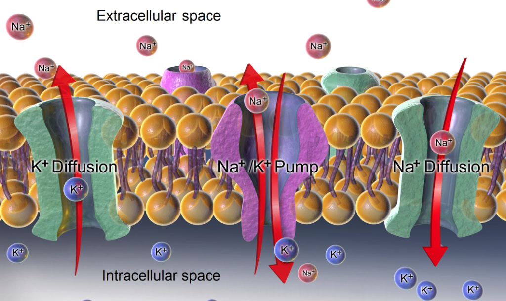 4) 전압개폐성 K+통로가 열려 세포 안에 높은 농도로 존재하는 K+이 세포밖으로 유출되면서 막전위는 음의 값으로 급격히 감소함.