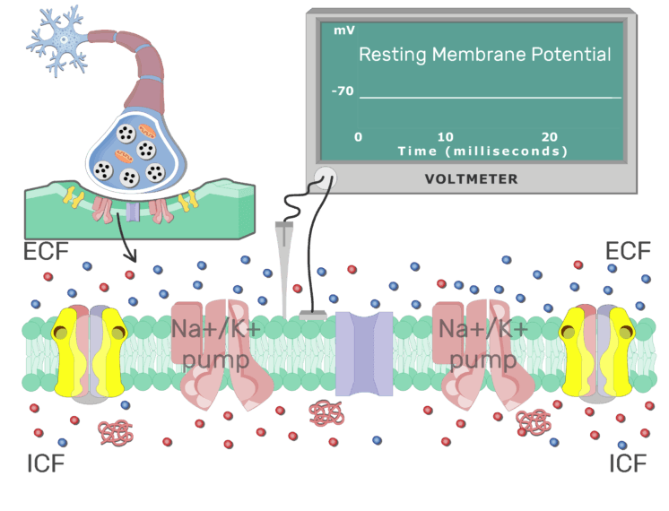 신경세포의 안쪽과 바깥쪽에는 여러종류의 양이온과 음이온이 존재하는데 이들 이온의 불균등한 분포로 인한 전하량 차이때문에 세포막 안쪽과 바깥쪽 사이에 전위차가 형성됨. 일반적으로 세포막을 사이에 두고 생긴 전위차는 세포바깥을 0mV로 할때 세포 안쪽이 훨씬 낮은 -70mV 정도임. 이를 휴지막전위(resting potential)라고함. 신경세포에 전달되는 흥분성 신호의 세기가 억제성 신호의 세기를 넘어서면 즉 세포로 유입되는 양이온의 양이 음이온의 양보다 많아져서 -70mV인 휴지막 전위가 역치인 -55mV정도까지 변하는 탈분극이 일어나면 신경세포는 활동전위를 발생하여 정보를 전달함.